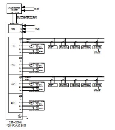 GST-QKP04可帶4個區(qū)的氣體滅火設備,實現(xiàn)對4個防護區(qū)的保護;GST-QKP04/2可帶2個區(qū)的氣體滅火設備,實現(xiàn)對2個防護區(qū)的保護。其中每個區(qū)所帶設備及數(shù)量如下: